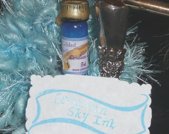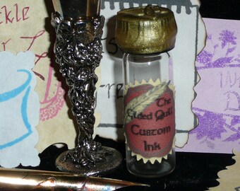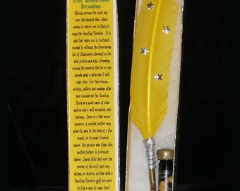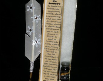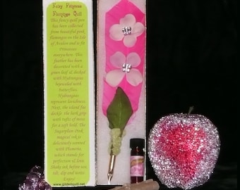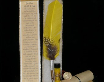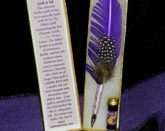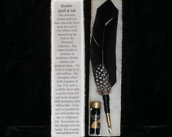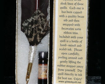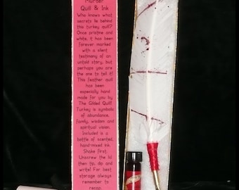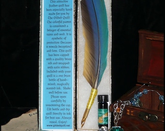 The set includes 1 dram of apple scented Crabapple ink and comes packaged in an attractive gold box with soft cotton lining. These are handmade so though the style will be the same, no two feathers are alike :)