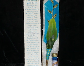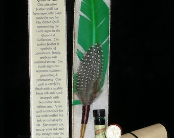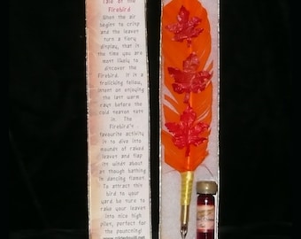This red quill was made to represent the Fire Elemental. It has been embellished with small decorative feathers and wrapped in orange satin ribbon. The nib is brass, for use with dipping ink.