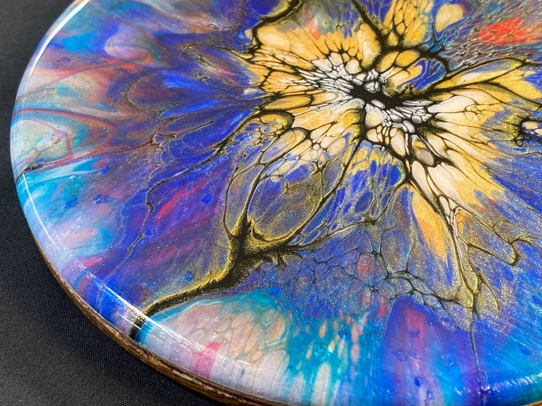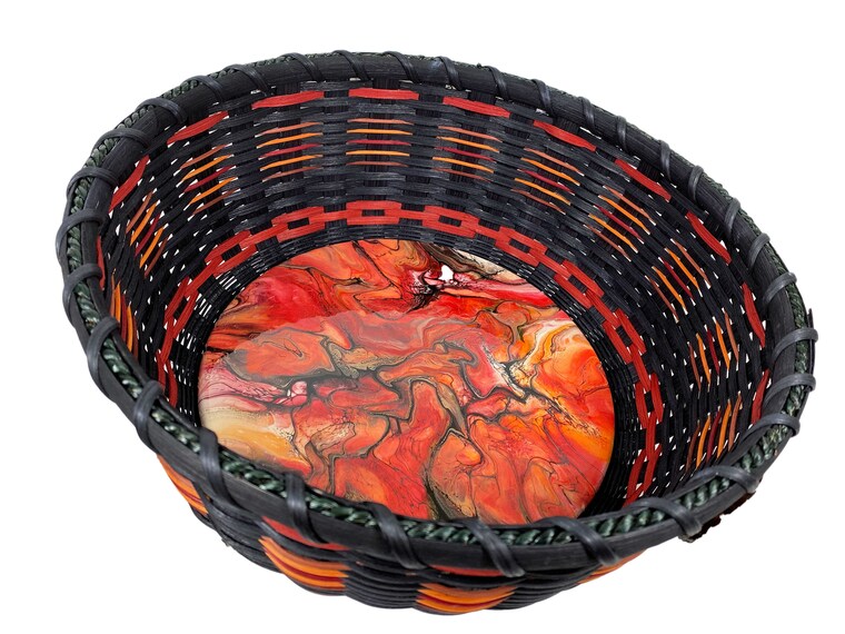 As I have been exploring more contemporary designs for my basketry, I've been drawn into fluid acrylic paint pouring. There are so many different techniques! My shop continues to expand highlighting unique, one-of-a-kind wood bases that display these varying techniques. You'll see these painted and epoxy resin (high temperature and food grade) coated wood bases pop up in mini drilled bases for either twining or pine needle coiling, as bases used in my own baskets available for sale, and soon to be released ... basket weaving kits and sold individually for your own creative weaving.