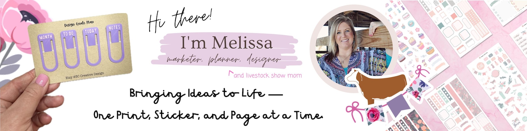 ¡Hola y bienvenidos a mi tienda! Muchos de mis diseños son para mi agenda diaria y me emociona compartirlos con ustedes. Cuando no estoy diseñando ni trabajando con mis clientes de marketing, ¡soy una mamá muy ocupada en exposiciones ganaderas!