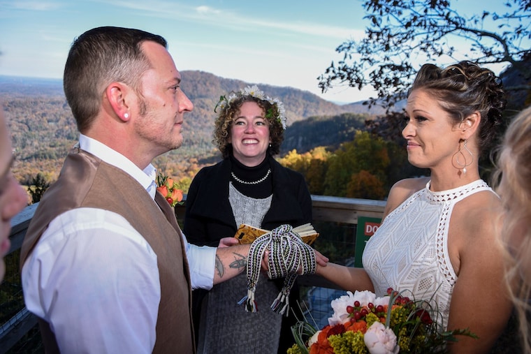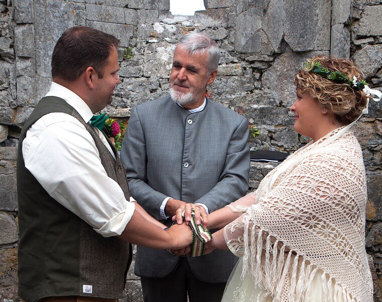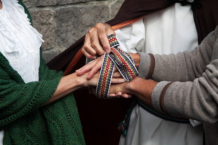 Outdoor handfasting using a cord with the colours representing family members.