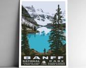 I thought I'd take a crack at them. My whole life, I have loved the WPA travel posters of the 1930s and 1940s. And I wanted to create posters that captured, or at least paid homage to, that vintage style. So the first three posters, Glacier, Acadia, and Banff, were soon designed, framed, and hung on the wall of our unborn child.