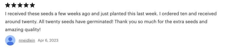 5 étoiles sur 5J'ai reçu 11 graines. Je les ai semées dès leur réception. Pour l'instant, le taux de germination est de 100 %.