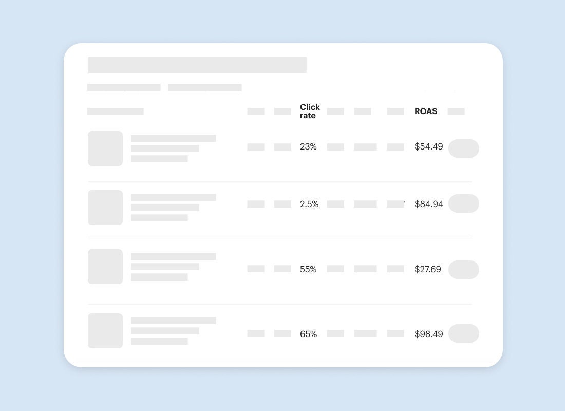 Now in the Etsy Ads dashboard, you can see the click rate and return on ad spend (ROAS) for each of the listings you’re advertising. Click rate is the percentage of your ad views that result in a click. ROAS tells you how much you've made from every dollar you’ve invested in advertising.