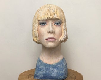 Sculpture, Juliet, painted terracotta, portrait, head of woman, Girl with the bob, italian art, gift for friend, creative art, model