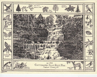 This 6-pack of blank, ivory cards features a detailed pen-and-ink illustration of Chittenango Falls State Park, birds&plants by LC DeVona