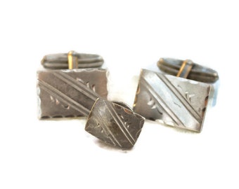 Gentleman’s Sterling Silver Cuff Links and Matching Tie Tack Vintage Forstner – STG Engraved Design - Made in the USA