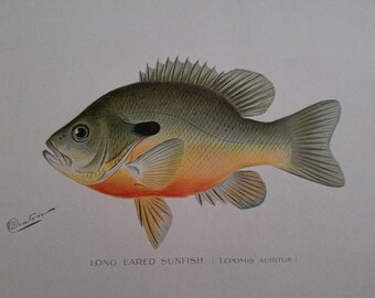 Denton Long Eared Sunfish Chromolithograph Original Antique Print / Original Lithograph by Sherman F. Denton 1902 / Gift for Him #2351