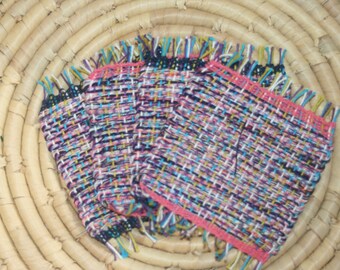Eco Friendly Mug Rugs - Multi Color Handwoven Coasters - 4 Coasters Set - Cheerful Table Art