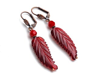 Carnelian Feather Earrings Vintage Hand Carved Swarovski Crystals Southwestern Gypsy Boho Red Brown Rust Coral Orange OOAK