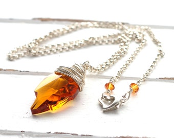 Orange Leaf Necklace, Topaz Swarovski Crystal Wire Wrapped Leaf Pendant, Sterling Silver Rolo Chain, Autumn Necklace, Fall Necklace