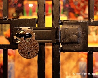 All Locked Up, black, orange, square, lock, colorful, lines, bars, gold, red, photograph