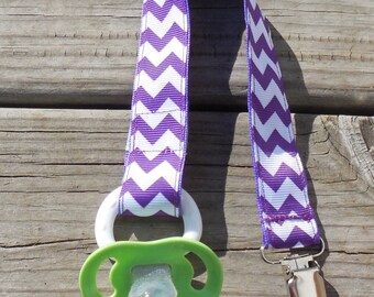 Purple Chevron Ribbon Pacifier Clip, Chevron Pacifier Holder, Binky Clip, Pacifier Clip or Toy Clip