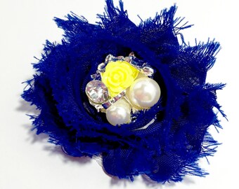 Navy Shabby Flower Brooch, Flower Brooch, Shabby Flower Pin, Navy and Yellow Brooch, OOAK, Handmade Brooch,