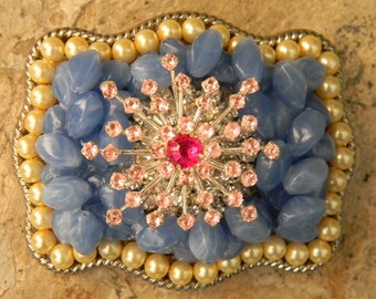Blue Beaded Belt Buckle, Womens Western Custom Buckle, Blue Beads Pearl Belt, Pink Belt Buckle, Womens Diva Buckle, Starburst Belt Buckle