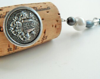 Wine Cork Ornament, Fleur De Lis, Silver Pearl Ornament, Beaded Ornament, Recycled Jewelry, Window Decor, Wine Cork Decoration, Sun Catcher