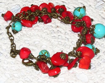 ON SALE -50%.Handmade bracelet made of small pendants with turquoise and coral, ethnic style, modern, gift