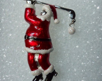 Golfing Santa Pin! Perfect 4 Golf Lovers! Silver Plated Santa! Red Enamel Santa Suit! Signed Danecraft! White Enamel & Rainbow Glitter Trim!