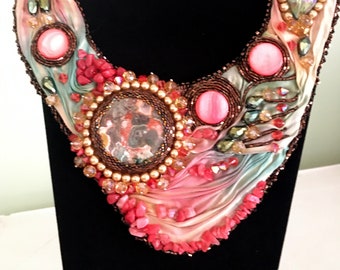 Silk Road Sunset, Gorgeous Shibori Ribbon Beaded Necklace, Textile Necklace, Statement Necklace