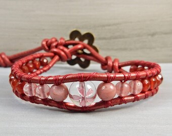 Red Bracelet. Cherry Blossom Bracelet. Sakura Jewelry. Healing Crystal Jewelry. Handmade Leather Wrap Bracelet. Jewelry for Women. Courage