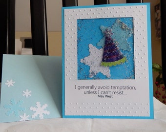 Handmade Birthday Card: complete card, handmade, balsampondsdesign, winter, snowflakes, quote, May West, blue, ooak