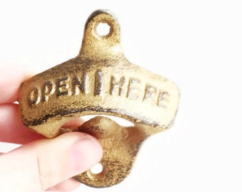 Gold Open Here Bottle Opener, Cocktail Accessories, Boho Kitchen Decor, Retro Bar, Wall Mount Beer Opener, Homebrewer Tools, Gift for Him
