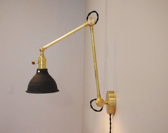 Industrial Articulating Brass Wall Lamp with Black Shop Shade - Task Light - Factory Light - Handmade Brass Lamp