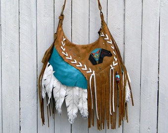 Leather Boho Fringe Bag Southwestern Style Shoulder Bag with Bear Applique Tan Nubuck Leather Crossbody Bag with White Feathers OOAK