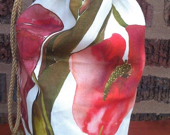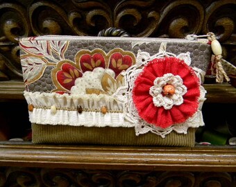 Shabby Chic Floral Clutch Beige Red Quilted Fabric Wristlet Hand Crochet Embellished Boho Make Up Bag Evening Pouch OOAK