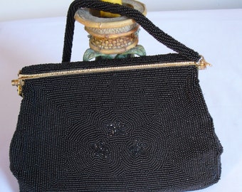 vintage,black beaded purse,fully lined, beaded in a star design on the front and the back,excellent condition, gold trim magnetic closure