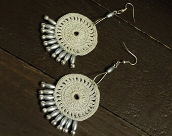 Crochet earrings, boho, textile jewelry, beaded earrings, bohemian, gray, geometric, long, dangles, boho jewelry, circle