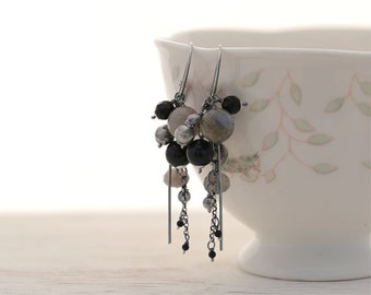 Sterling Silver Earrings, Dangle Long Earrings, Grey Black Earring, Onyx Labradotite Earrings, Modern Earrings, Sylviaartgallery