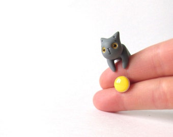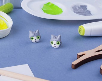 Grey cat with yellow eyes + yellow stud - polymer clay jewelry - hand painted stud earrings - fake plug (NO20)