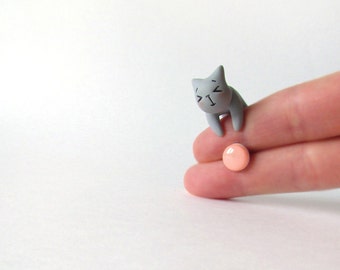 Grey cat + coral stud - fake gauge - fake plug - hand made polymer clay jewelry - summer collection (NO96)