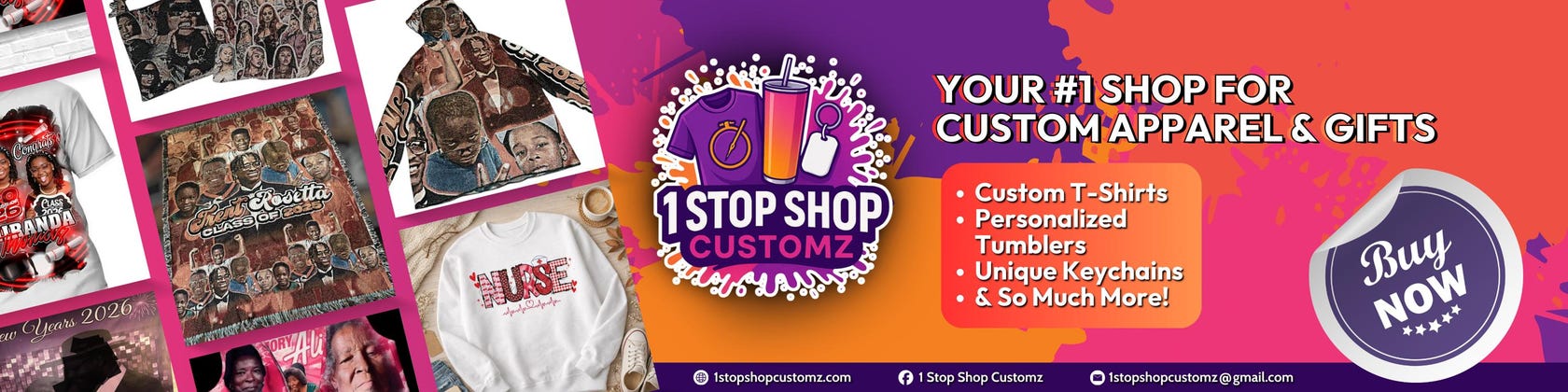 Our goal is to grow 1 Stop Shop Customz into a worldwide, family-oriented business rooted in creativity, quality, and trust. When you shop with us, you’re supporting a small business built with love, resilience, and a whole lot of fun.