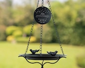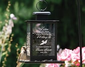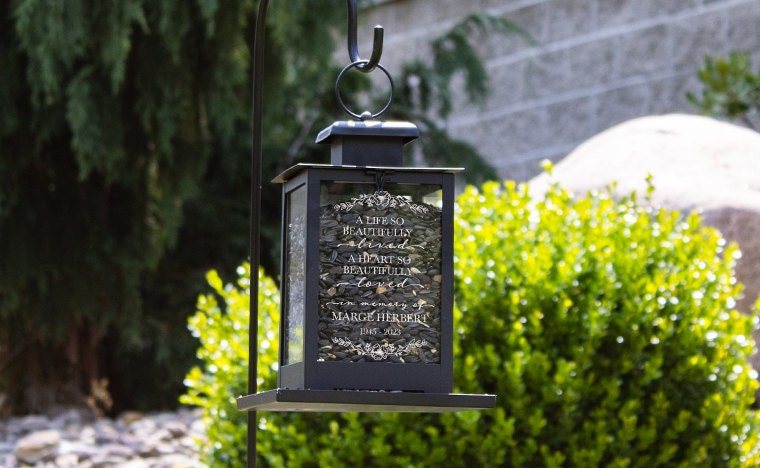 Personalized memorial bird feeders and other garden decor.