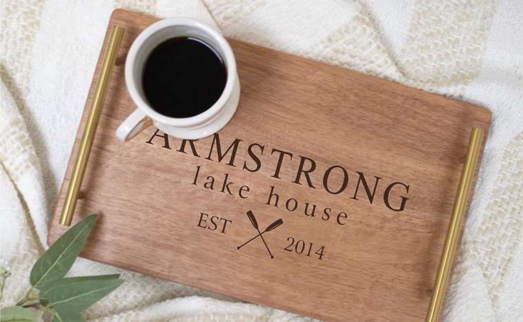 Wooden serving trays with handles engraved with your personalization. -