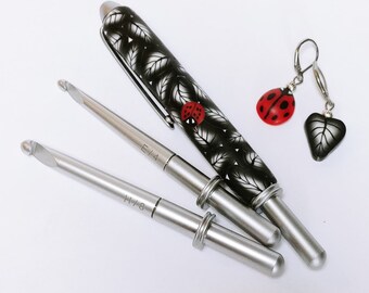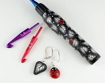 Interchangeable Ergonomic Crochet Hook Set - Black and White Leaves