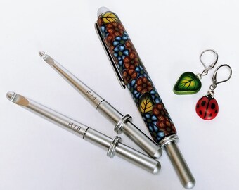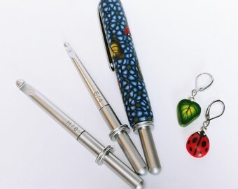 Interchangeable Crochet Hook Set - Denim Blue and Burgundy Floral