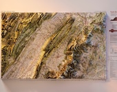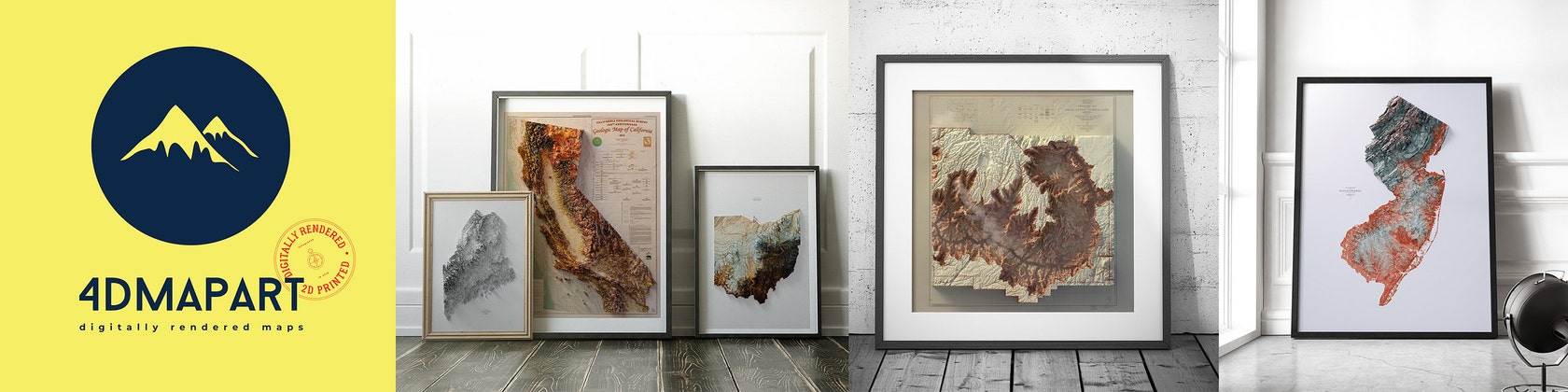 Los mapas que hago aparecen en 3D debido al proceso de renderizado digital, pero en realidad son 2D / planos (impresos en HD Metal, HD Photo Paper o Fine Art Paper). NO son mapas de relieve elevados o mapas impresos en 3D.
