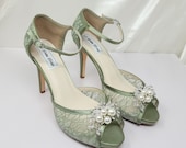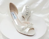 Traditional ivory lace wedding shoes with a feminine pearl and crystal design. -