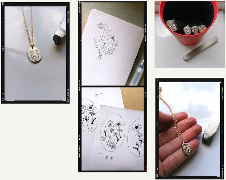 Each personalised and botanical necklace and bracelet is hand stamped, using custom made metal stamp blocks. -