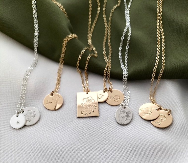 Delicate and personalised gold filled jewellery handmade in Ireland: initial necklaces, birth flower and birth stone pendants and bracelets. Designed and hand made to order with love and care in our Dublin studio.