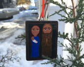 But in real life, I’m a pretty cheerful person. So I had a good night’s sleep and woke up feeling refreshed. I really wanted to paint, so I made the decision to compromise, because I’m a sell out. I was going to freehand sketch my paintings and then paint them with acrylics (the sell out medium until Jackson Pollock made them trendy). But I was going to use many of the Icon writing techniques and blend them with my folkish style.