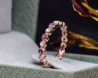 Eternity ring with alternating White opals and sapphire, ruby, amethyst, blue topaz, citrine
