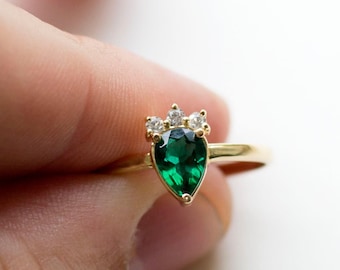 Emerald and Diamond gold crown ring, Fan ring, Tiara ring, Stacking ring, anniversary ring, pear cut, gold ring , princess ring