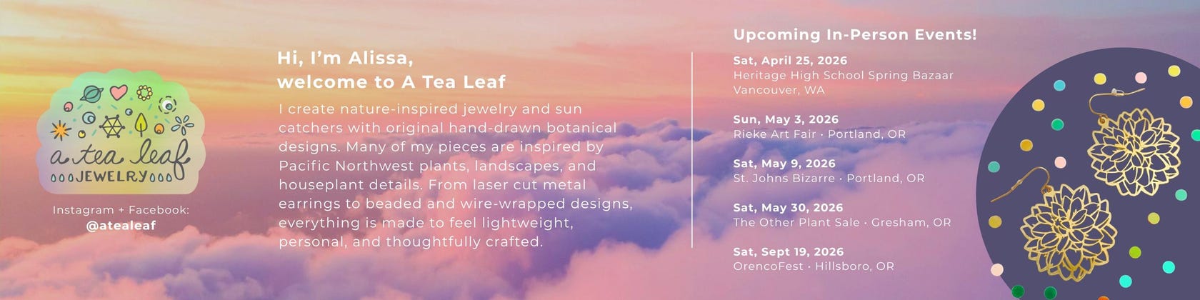 Today, A Tea Leaf jewelry is still inspired by nature and exploring the Pacific Northwest as well as vintage touches. It all happens from A Tea Leaf HQ (my home studio).