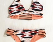 First I create a pattern from scratch using your specific measurements. I take into consideration your height and weight to ensure an exact fit. Next I test the fabric and judge which areas would look best for the style of top or bottom and where it stretched most. Once the bikini is cut, I begin the sewing process. Depending on the style, I may use up to three different machines followed by a small section that I sew by hand. Once the piece is finished, I cut any remaining threads and check for any imperfections. When I am completely satisfied with the finished product I wrap it up with extra love and send it on its way to you.
