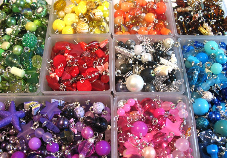 Making a collection of bead charms, by color.