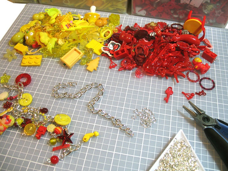 Gathering red and yellow bead charms and trinkets for a fun charm bracelet. -